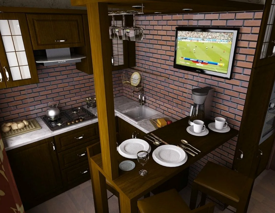 Интерьер кухни 6 кв м нуждается в свободном пространстве. Складные столы и стулья или откидная барная стойка помогут его получить!