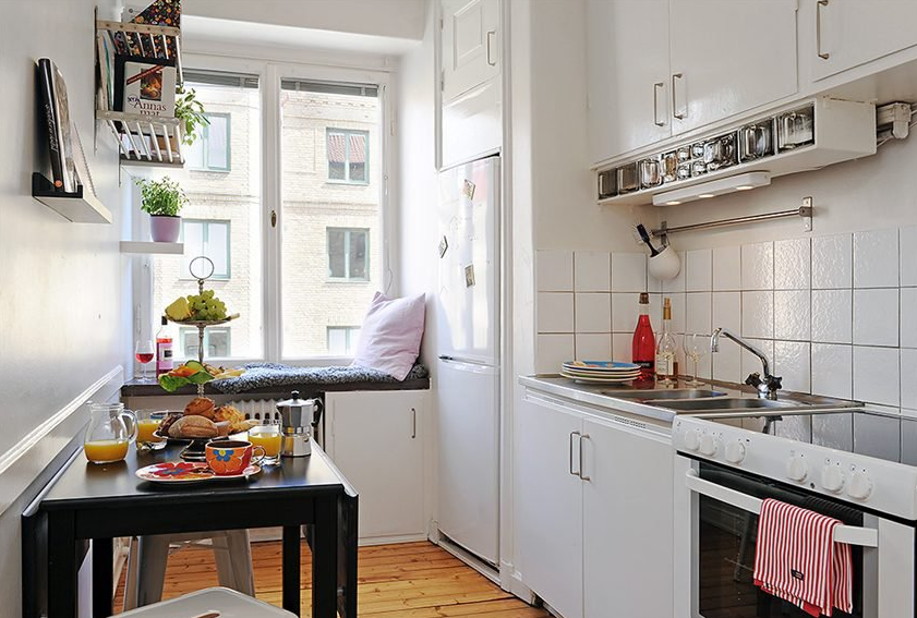 При этом важно комфортно разместить поблизости друг от друга три основные зоны: хранения, готовки и обеденной группы. Хотя на небольшой кухне как раз это и не станет большой проблемой.