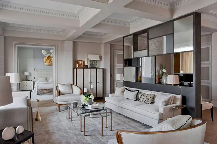 Теплые белые ноты сделают обстановку уютной, безмятежной, чистой с расслабляющим эффектом. Это действие хорошо подойдет для отделки небольшого помещения с открытой планировкой.