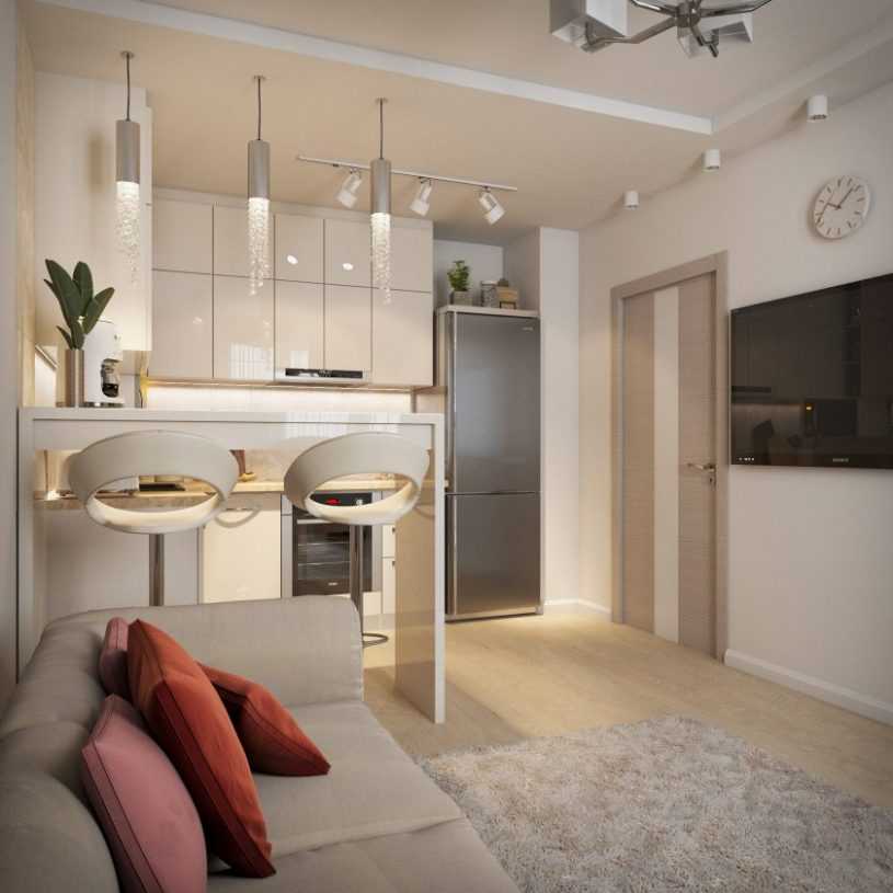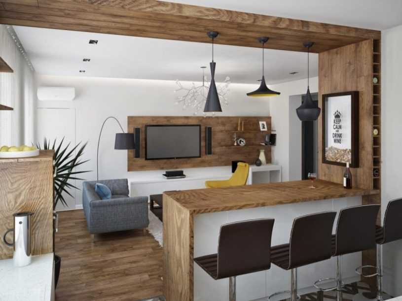 Её можно возвести самостоятельно либо использовать часть оставшейся стены. Элемент выполняет декоративную функцию, делая помещение очень стильным и модным. Вместе с тем барная стойка позволяет экономить пространство, заменяя большой стол. Она обозначает границы гостиной и кухни, одновременно объединяя их между собой. Материал изготовления зависит от общей отделки и стилистики помещения.