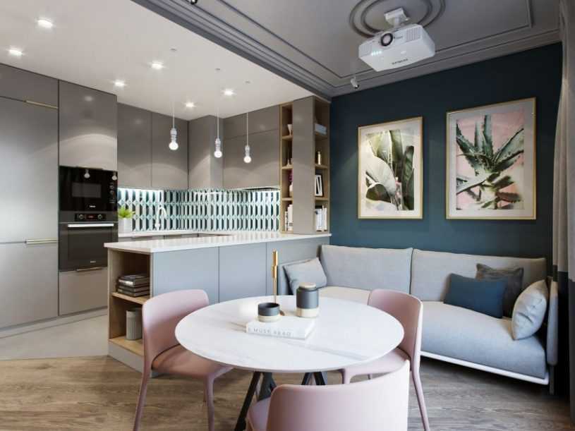 Если конфигурацией комнаты-студии предусмотрен уголок за зоной готовки либо барной стойкой, то заполните пустующее место диваном и оформите в соответствующем ключе стену за ним. Можно повесить полочку, картины, подключить стильные светильники. Такой диван будет верно служить для отдыха, а комната получит цельное художественное исполнение.