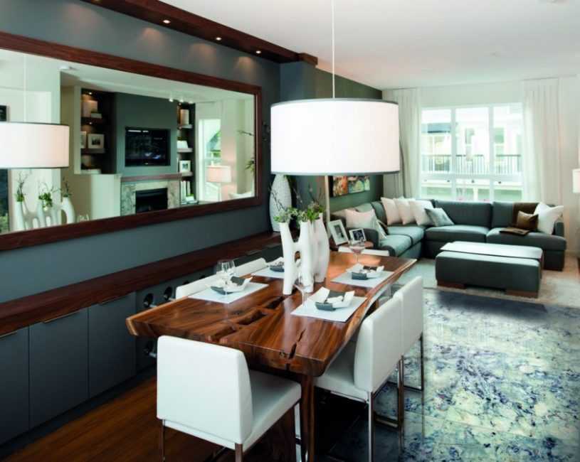 А что если взять и поставить обеденный стол по центру небольшой комнаты, а вокруг него установить Г-образный диван? Такие решения вполне жизнеспособны и обоснованно претендуют на статус дизайнерских.
