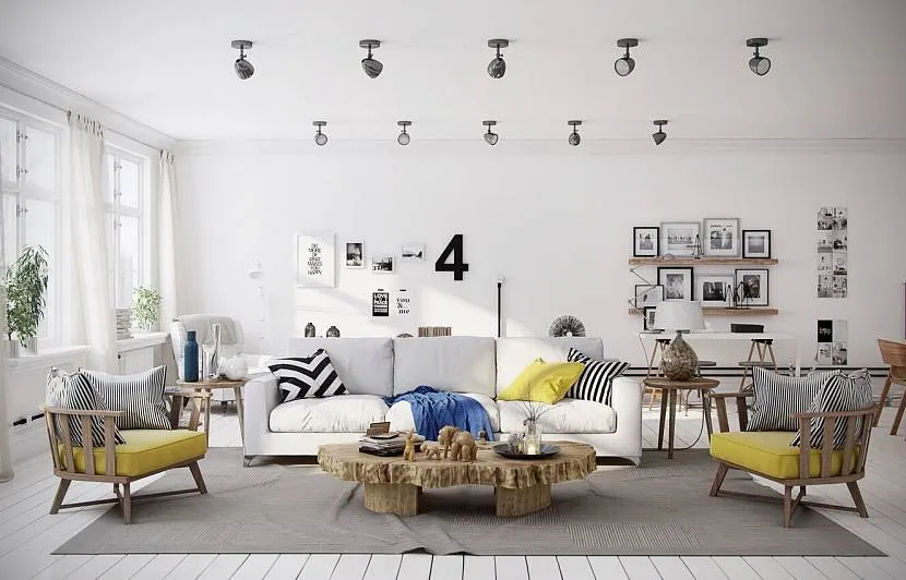 Основа стиля — белые стены, мебель и покрытие пола — светлое дерево. В качестве цветовых акцентов чаще всего используется черный или серый — эти цвета великолепно сочетаются с белым.