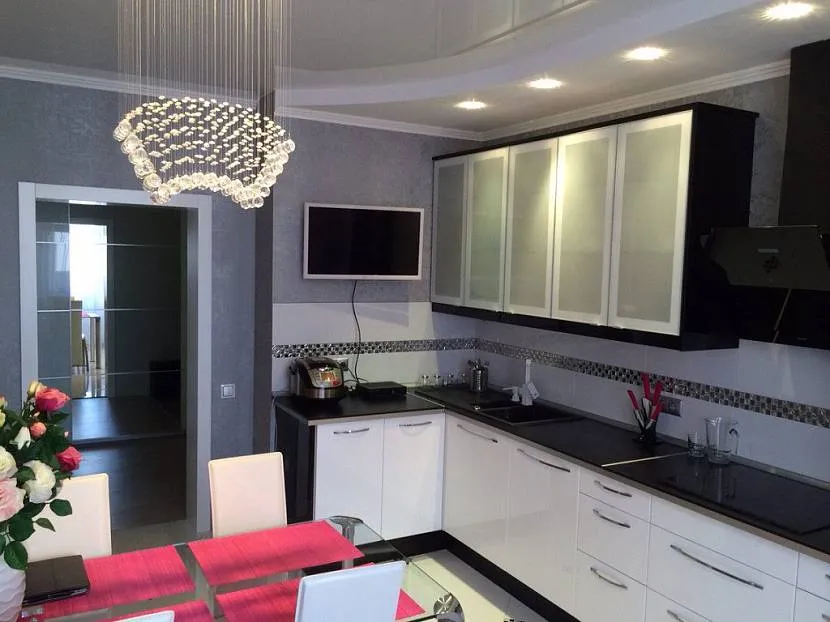 Для стен предпочтительнее брать материалы светлых, белых или пастельных тонов. Они не скрадывают пространство, а, напротив, расширяют его. Чтобы интерьер не казался излишне «лабораторным», добавьте немного «рок-н-ролла» в виде цветовых пятен. Но не увлекайтесь, помните о разумности контрастов! Обои можно использовать для гостиной, кафельную плитку – для кухонной зоны.