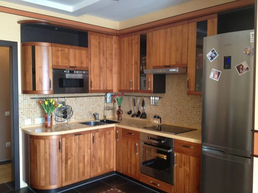 - Если на первом месте для вас стильность, лучше выбрать мебель с деревянным каркасом из бука или дуба. Берёза и сосна менее долговечны, но тоже будут неплохим вариантом. Благодаря современным пропиткам, дерево не подвергается разрушительному действию влаги, но, тем не менее, хорошая вытяжка на кухне с деревянной мебелью нужна.