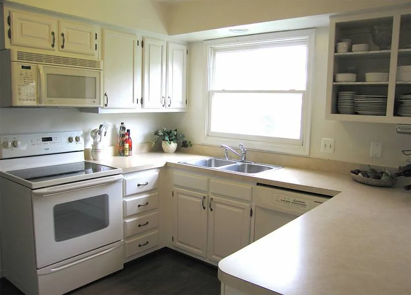 Обеспечивает удобный рабочий уголок, в котором все предметы и утварь всегда под рукой. Здесь располагается Г-образный гарнитур. В противоположном углу или около свободной стены ставят обеденный стол. Это достаточно эргономично и функционально. Объем рабочей зоны зависит от того, какого размера стол, планируется ли поставить диван, какой ширины будут шкафы.