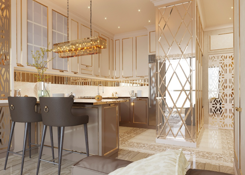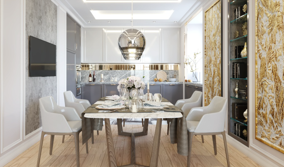 Для любителей статусных интерьеров прекрасным выбором является неоклассический дизайн кухни 2023.