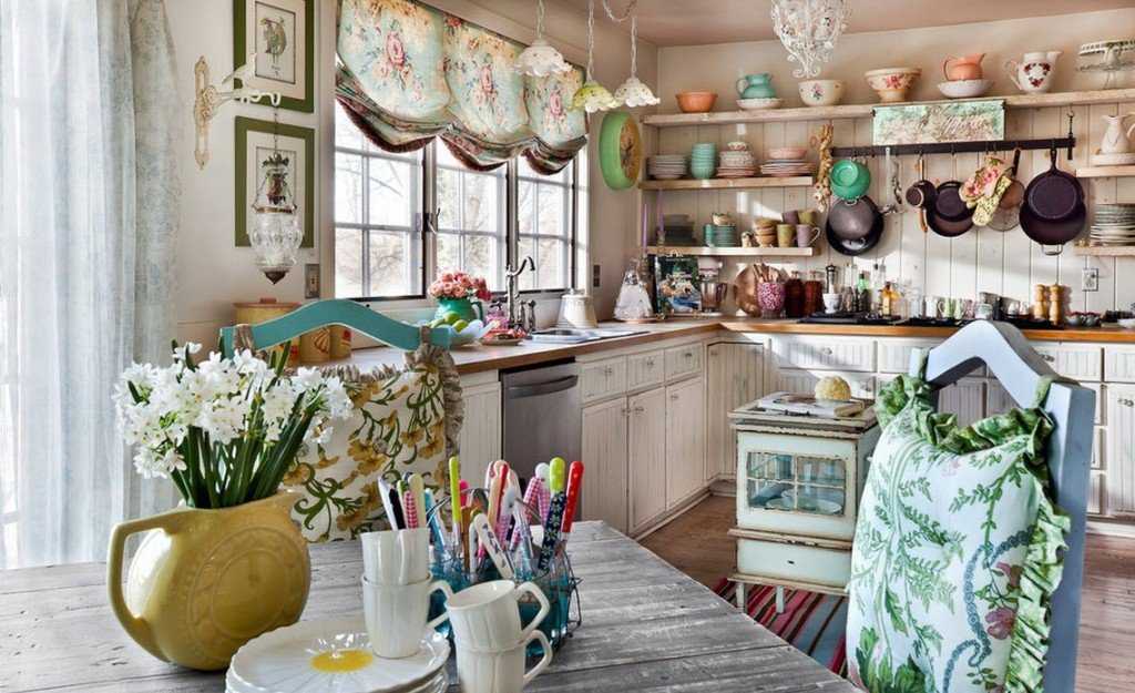 Кухня в стиле кантри – тумба со шторками, римские шторы на окнах, занавеска Источник pocketmags.com