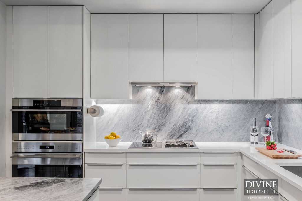 фартук все реже оформляется стандартной плиткой. Теперь в моде глянцевые панели, фотообои и покрытия, стилизованные под камень или кирпич. Стильная подсветка подчеркнет красоту и современность этой зоны.