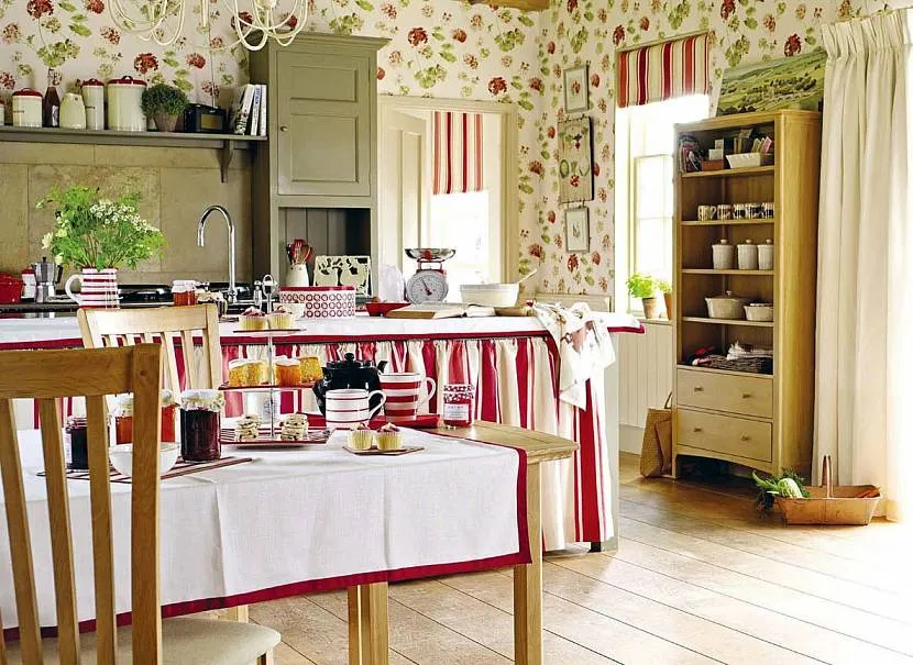 Прованс, рустик или кантри – подходящие стили для такого декора обеденной зоны.
