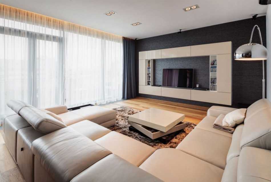 Для гостиной выбирают самую большую комнату, которая имеет 2-3 окна. В ней ставят угловой диван, кресла, телевизор, журнальный столик. Если гостиную также используют как спальню, мягкая мебель должна быть раскладной. Уместно будет установить стеллажи или шкафы с книгами, фотографиями, наградами членов семьи.