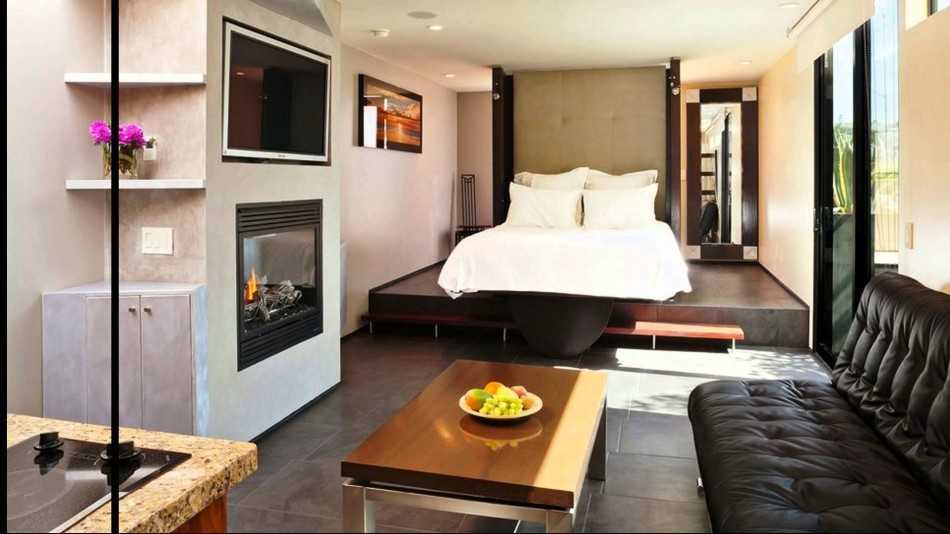 Место для отдыха и сна нужно располагать подальше от ванной и кухни. Пространство обычно выделяют подиумом или отгораживают ширмой, сквозным стеллажом. Иногда в дизайне используют текстильные занавески. Можно установить кровать-трансформер, которая днем будет убираться.