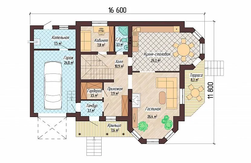 - при такой планировке все функциональные зоны работают плодотворно – домашний очаг, приём гостей, мастерская творческого индивидуума;