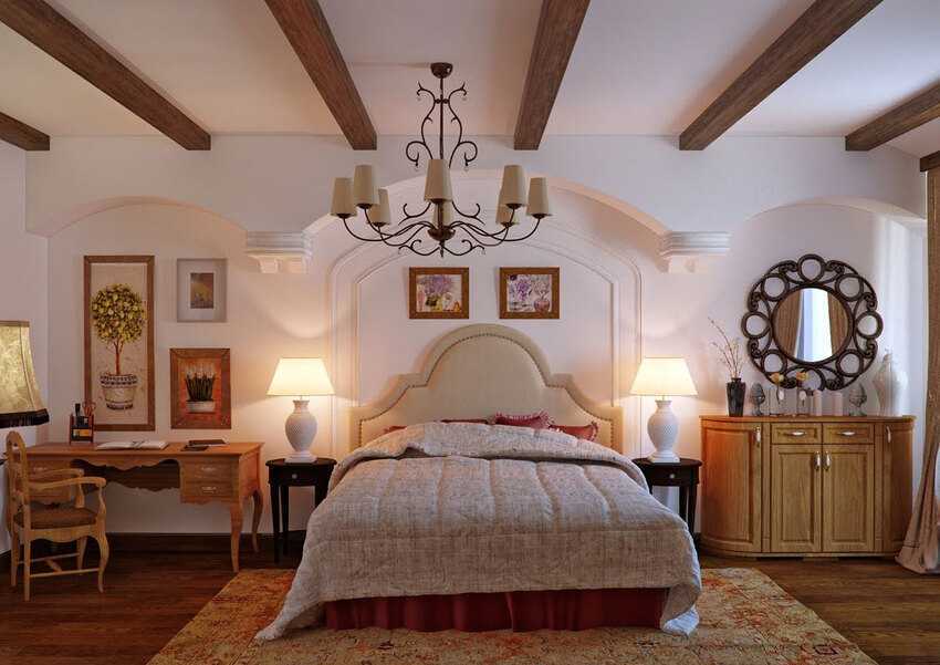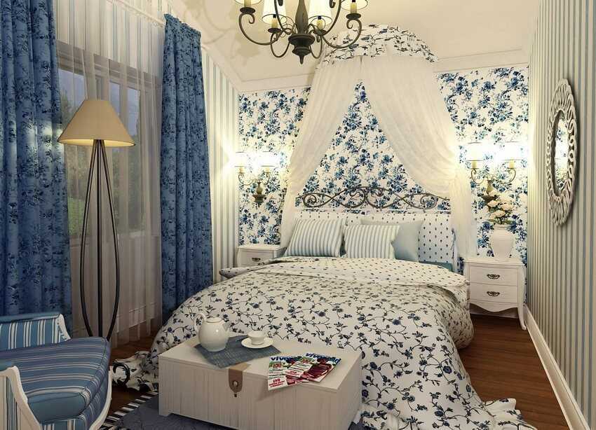 Для стиля прованс характерны большие кровати с коваными спинками, которые красят белой краской. Текстиль может быть однотонным пастельных цветов, украшенный кружевными вставками или нежным цветочным орнаментом.