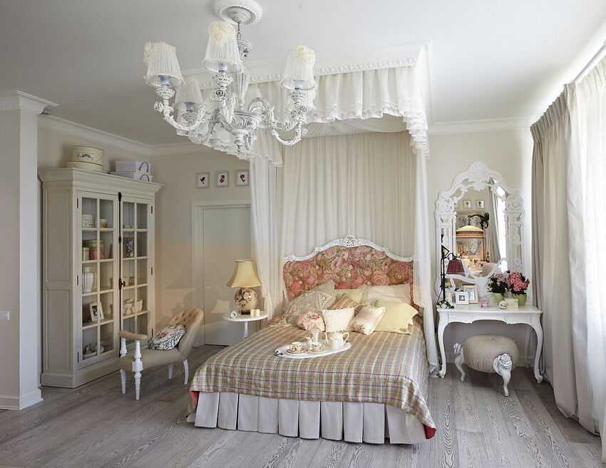 В интерьер спальни прекрасно впишутся комод и туалетный столик. На окна следует повесить воздушные шторы в классическом стиле.