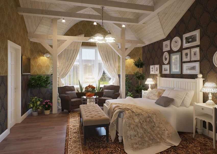 На потолок вешается массивная люстра, по комнате расставляются красивые подставки для цветов. Окна декорируются легкими полупрозрачными занавесками с флористическими мотивами. Что касается потолочной поверхности, ее можно оставить белой или деревянной и с большими балками, выполняющими декоративную роль. Пол в таком интерьере делается массивным. Для этого подойдут деревянные доски, камень или плитка с имитацией натуральных материалов.