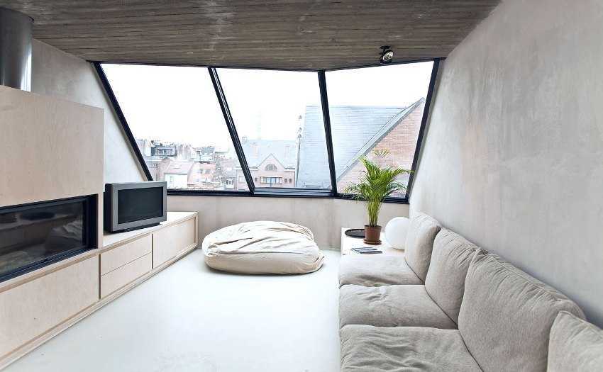 Очень здорово, если на вашей мансарде имеется потолочное, а не фронтальное окно. Это будет идеальным вариантом для оформления гостиной. Только представьте, как потрясающе будет проводить время с семьей или друзьями, любуясь звездным небом! Даже если ваше помещение имеет непропорциональную и вообще непонятную геометрическую форму, что бывает довольно часто, не беда. Спасти такое помещение поможет светлая палитра оттенков и пара ярких акцентов. Желательно стены, пол и потолок выполнить в одном цвете, чтобы стереть границу перехода. Ярким пятном могут быть подушки на диване, небольшой коврик или стена, которая имеет наиболее правильную форму. На фоне такой стены правильно будет расположить ТВ-зону.