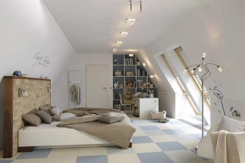 Чтобы на чердачной спальне было светло, не достаточно порой бывает окон и искусственного освещения. Чтобы развеять устоявшийся стереотип, что чердак это темное место, для оформления следует выбирать светлые цвета. Например, светлые обои в цветочек привнесут не только света, но и оригинальности и уюта. Яркое оформление стен также привнесет больше эмоций в обстановку комнаты.