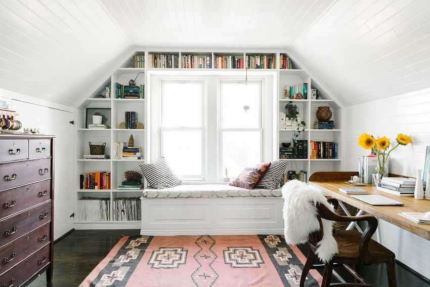Даже в большом доме бывает трудно найти место для кабинета, библиотеки или мастерской. Но чердак отличный вариант для создания уютной зоны для работы или творчества. Вы можете разместить открытые полки, стеллажи или шкаф на всю стену, мягкие кресла качалки для чтения, письменный стол. Большое покатое окно на всю стену будет обеспечивать достаточное количество света. В оформлении используйте бревно или светлые оттенки: помещение получится атмосферным и уютным.