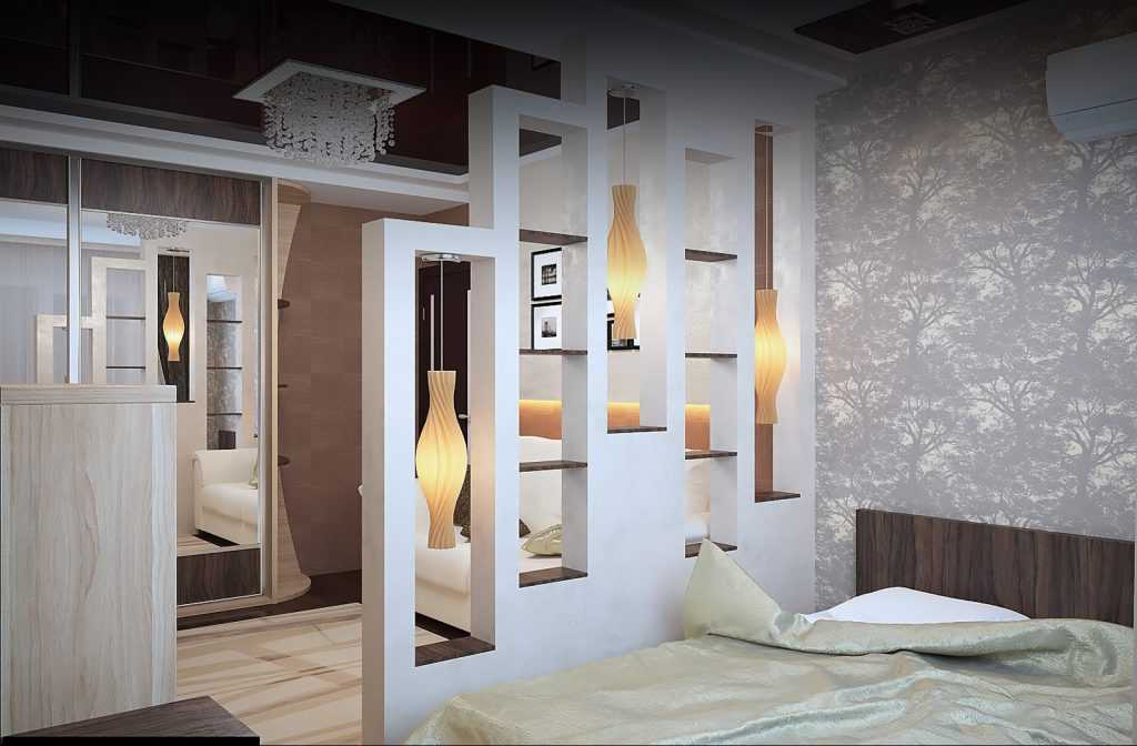 Размещение кровати в нише позволяет разделить спальню и зал. Иногда кровать отделяют с трёх сторон перегородками, создавая таким образом импровизированную нишу. Стены конструкции можно отделать другим цветом.