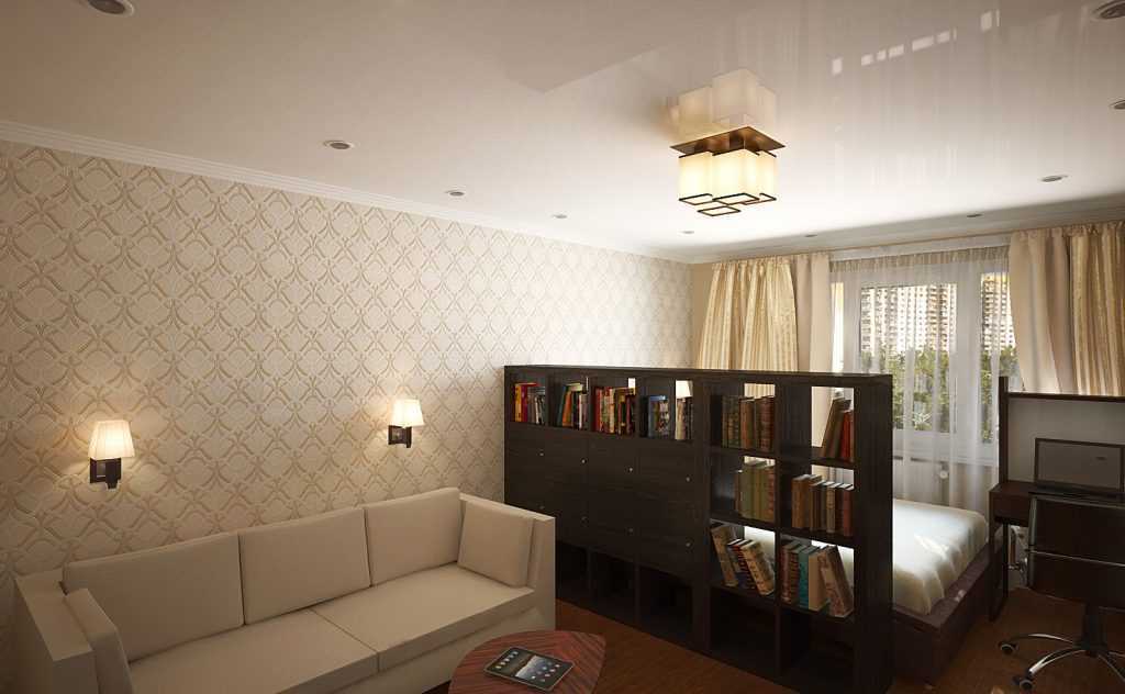 Стеллажами для книг или одежды можно разделить помещение на зоны, сэкономив при этом пространство. Такой вид перегородок может иметь различную высоту. Невысокие полки отделяют спальню от зала частично, стеллажи высотой до потолка полностью разделяют функциональные зоны.