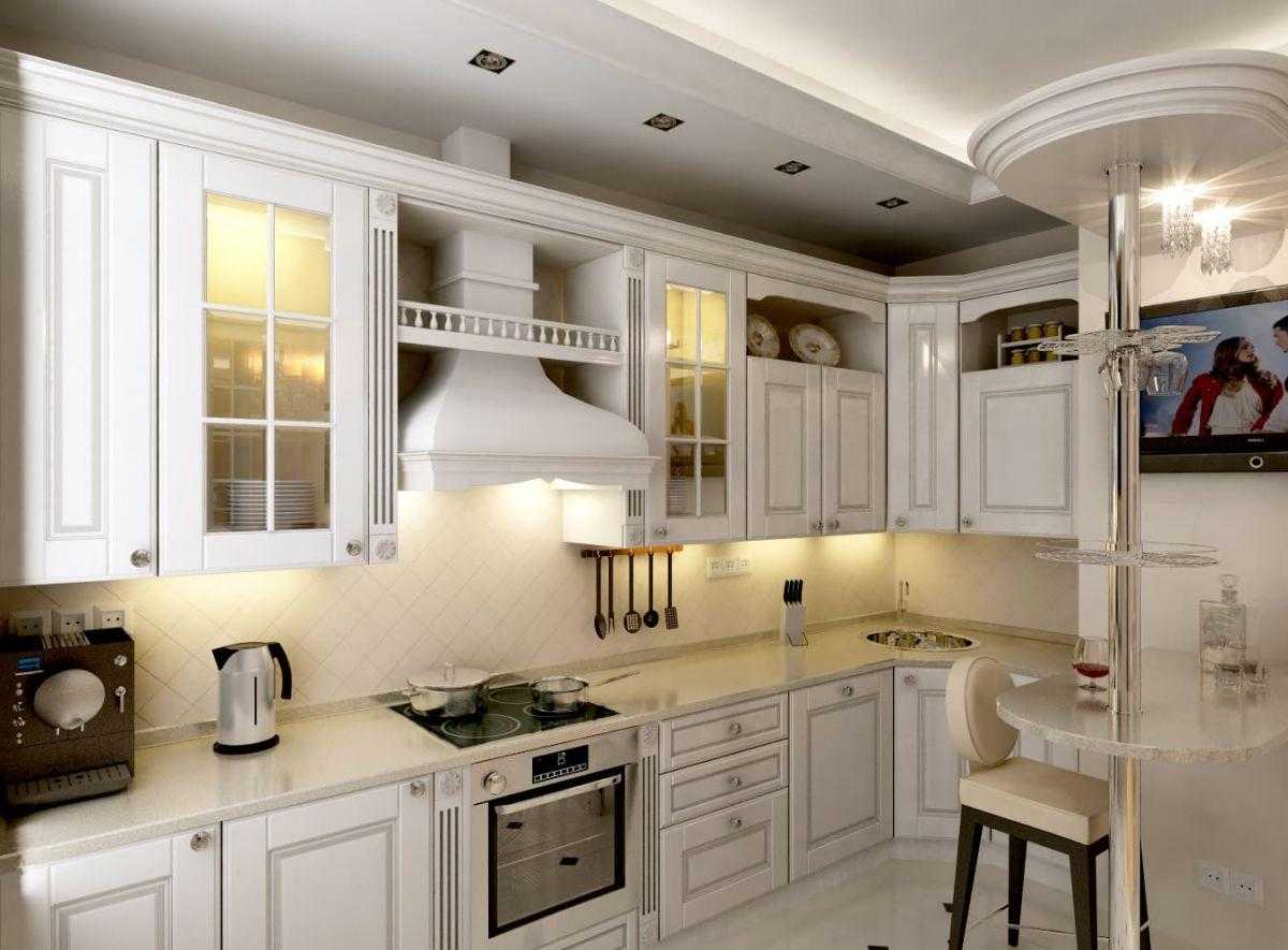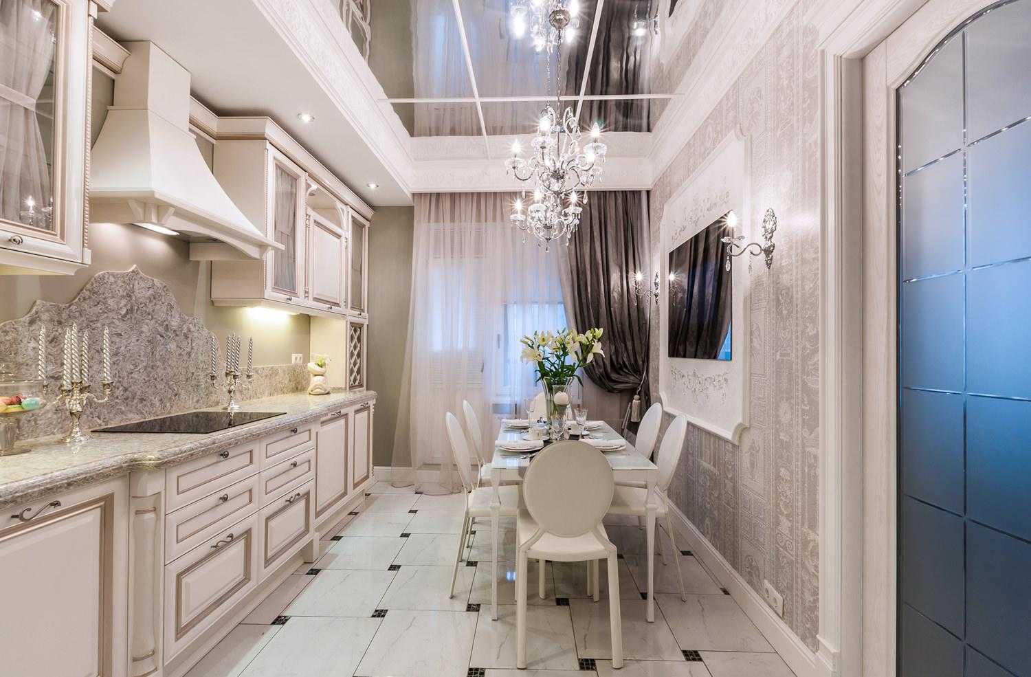 Белая кухня в классическом интерьере выглядит достаточно эффектно в просторном помещении. Зачастую в качестве декоров фасадов используют такие приёмы, как патинирование отдельных элементов золотом, серебром.