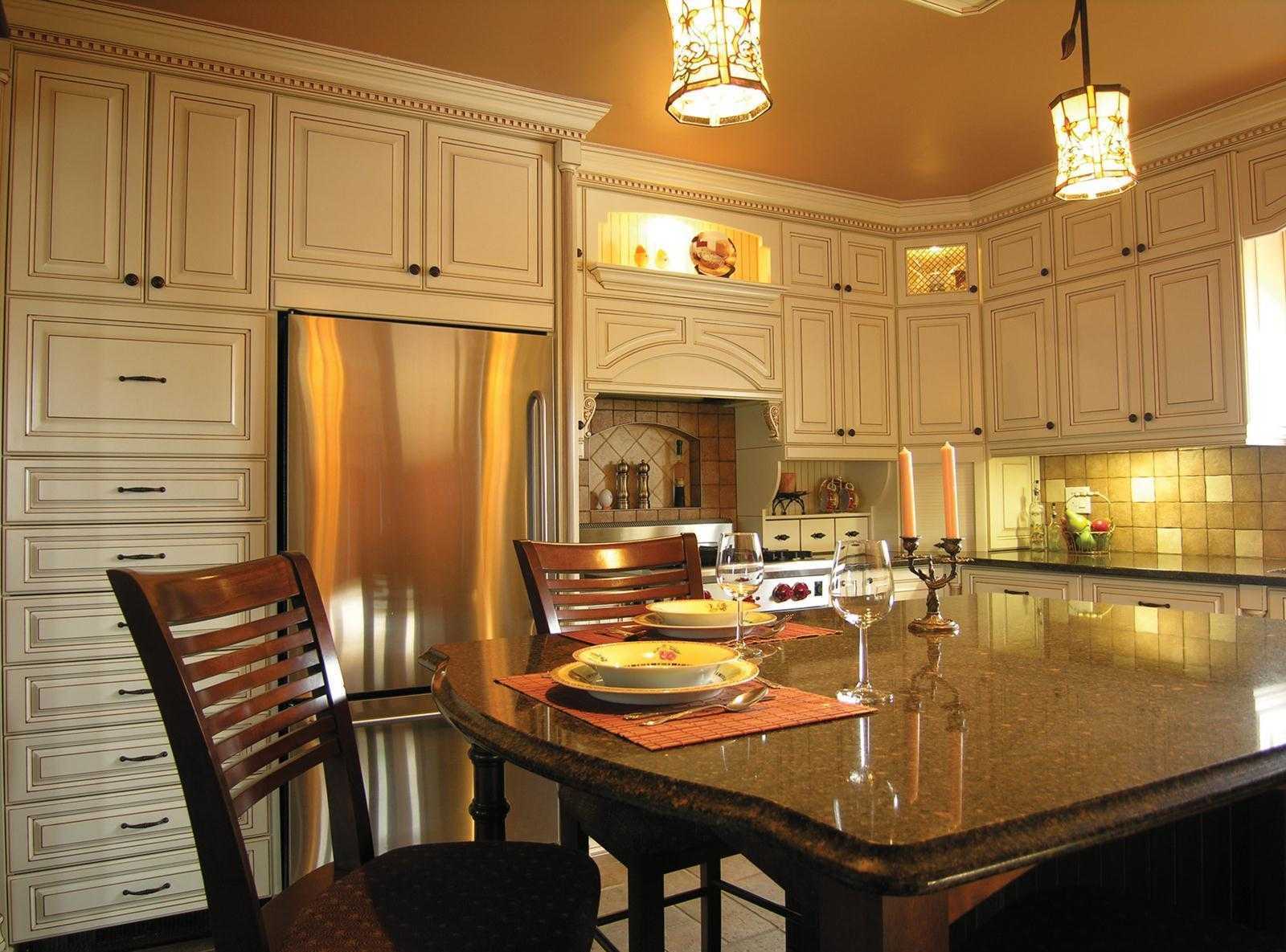 Дополнением рабочей зоны станет обеденная часть комнаты. Стол, стулья с резными ножками, украшенные резьбой, дополнят кухонный ансамбль.