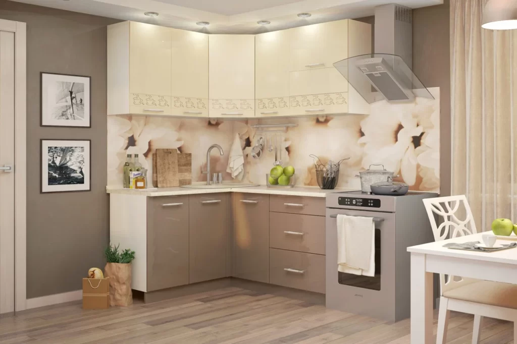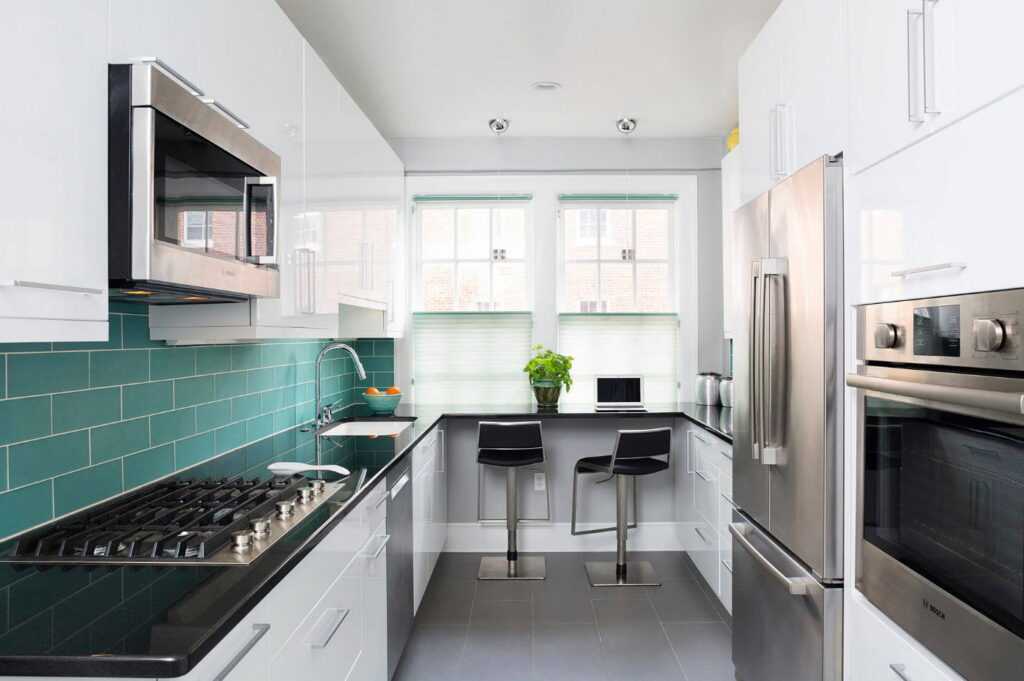 Выбирая кухонный гарнитур для маленькой кухни, следует обращать внимание на Г-образные или прямолинейные модели, устанавливаемые вдоль стены. Ни в коем случае не стоит покупать гарнитур, изготовленный буквой П — после его установки на кухне практически не останется места, будет лишь узкий проход