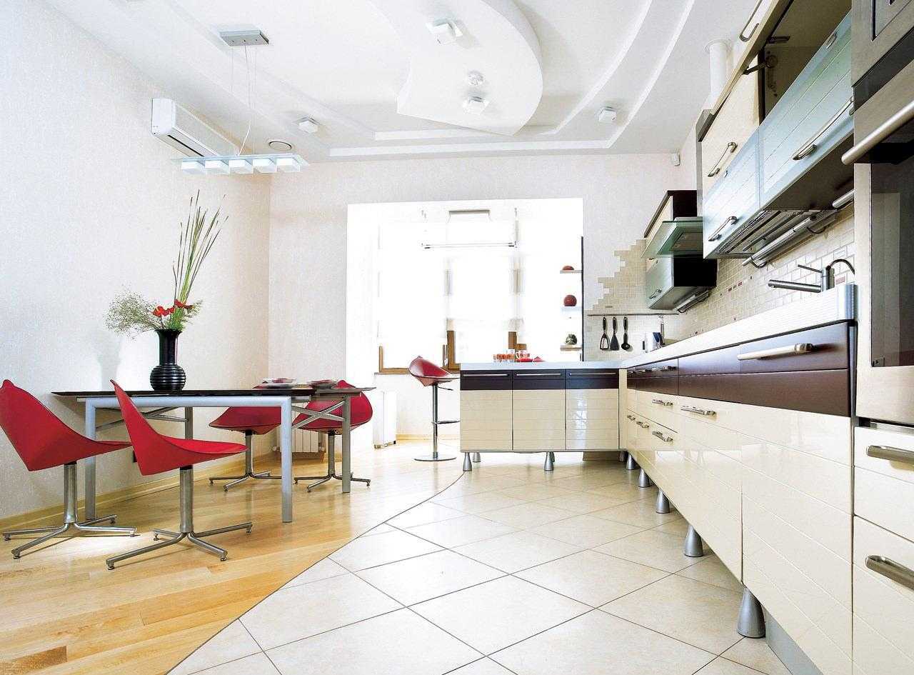 Но можно поступить и наоборот – совмещенную с гостиной кухню застелить одним материалом. Например, ламинатом, паркетной доской (из плотной и влагостойкой породы дерева), либо той же плиткой, но одного цвета. Такой прием поможет зрительно увеличить площадь.