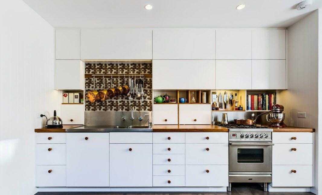 Что касается полок, то на таких кухнях их можно делать почти до самого потолка — сверху будут размещаться наиболее редко используемые в быту предметы.