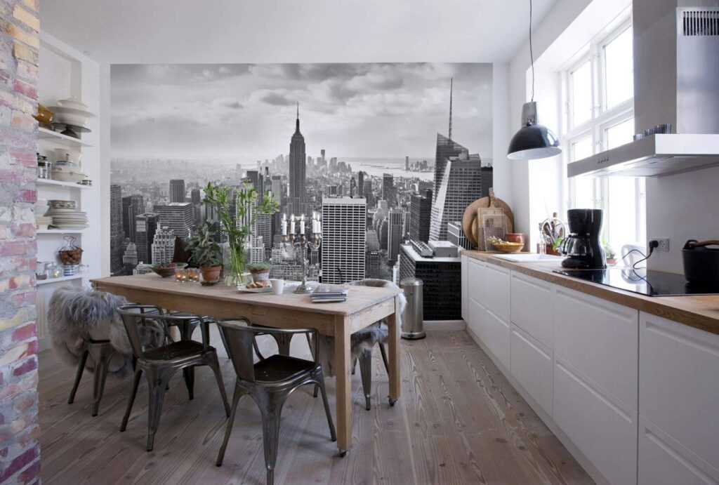 Чаще всего поверхности оклеивают однотонными обоями или оштукатуривают, окрашивают. Модный тренд — сочетание материалов, помогающее визуально разделить кухню на зоны. Поэтому для акцентной стены в столовой подбираются нестандартные решения: камень, декоративная кирпичная кладка, деревянная облицовка, пластиковые панели, фотообои. Рабочий фартук украшен керамической плиткой, мозаикой, стеклянными полотнами с рисунками.