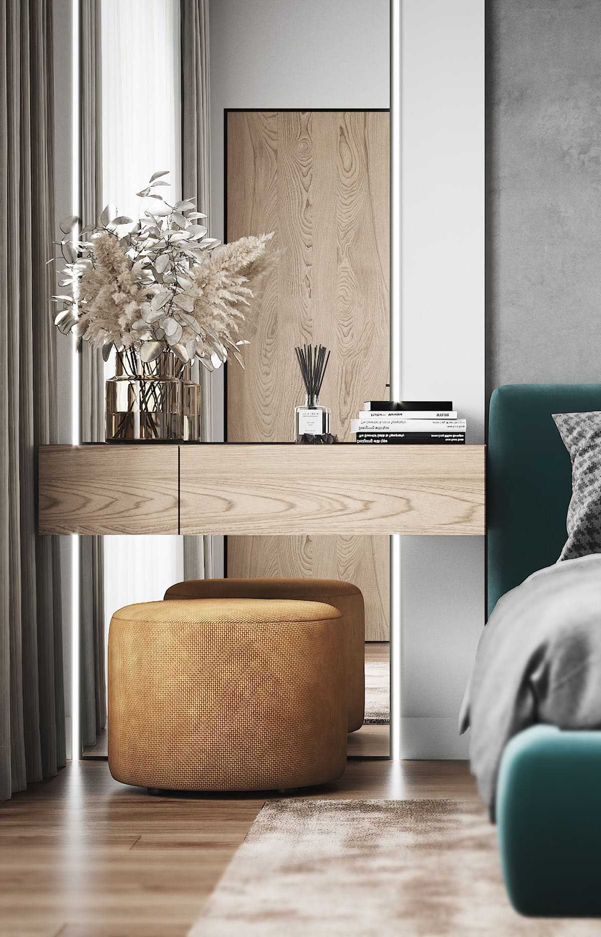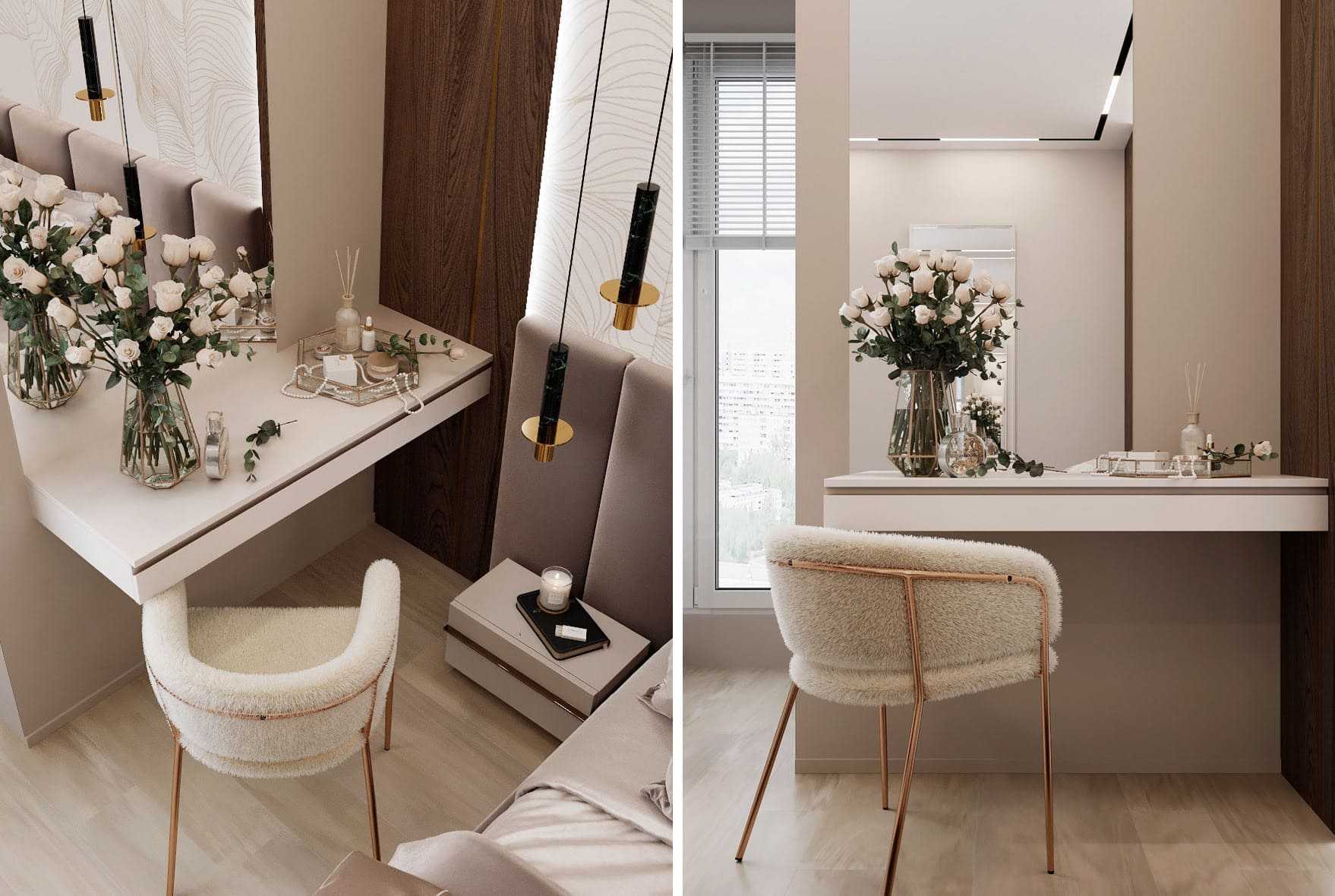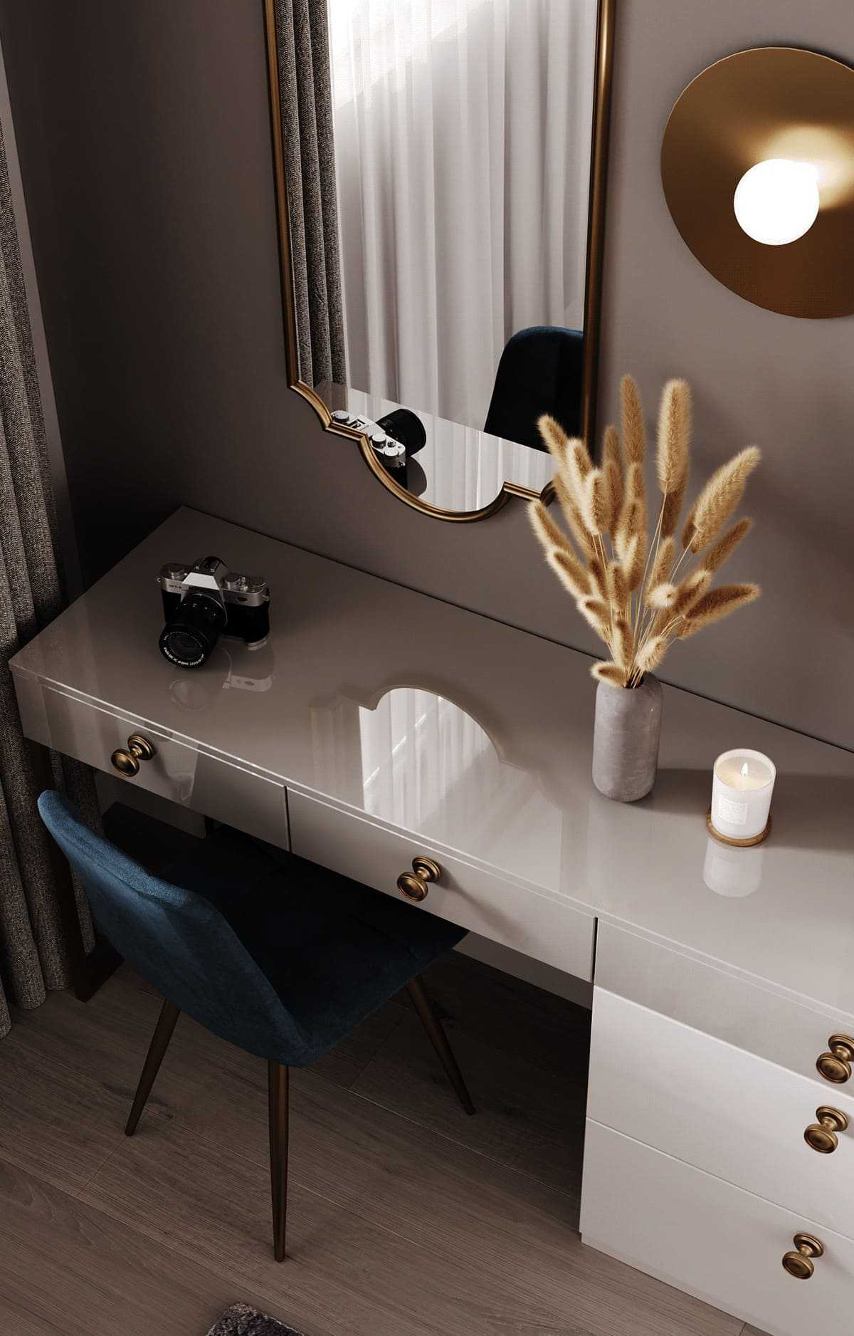 Туалетный столик придаёт спальням особый шарм и понравится многим женщинам. Предпочтите габаритной модели с тумбочками, ящиками и полками легкую консоль с навесным зеркалом — она выглядит стильно и компактно.