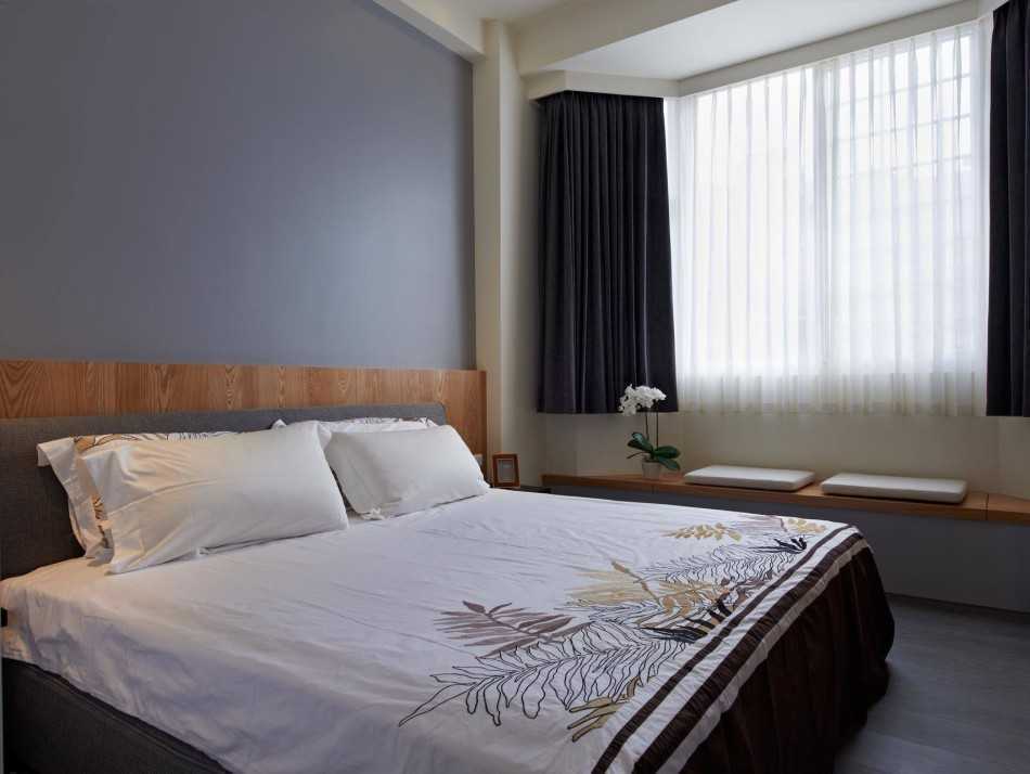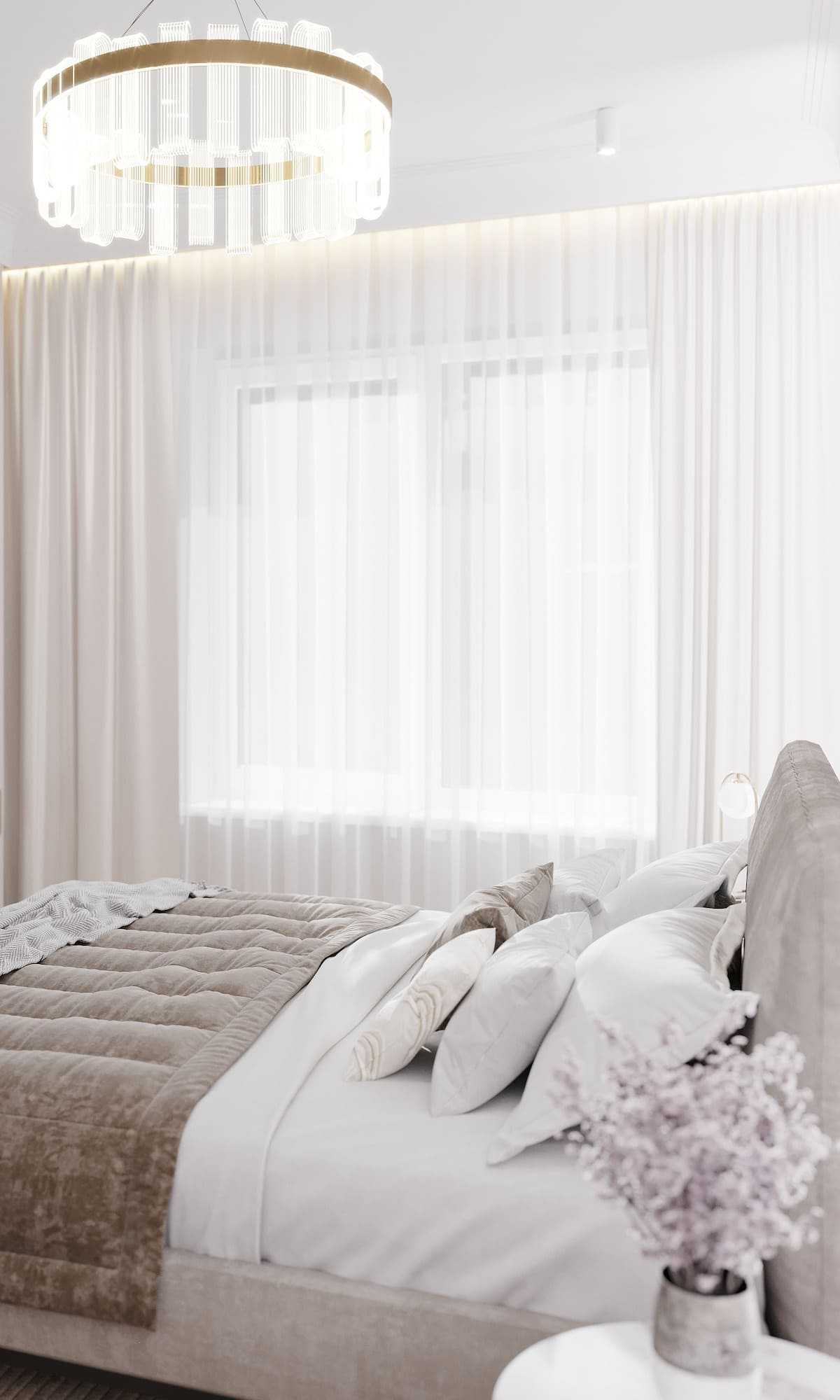 Оптимальным выбором будет использование римских штор или жалюзи. Добавление легких гардин на карнизе поможет визуально сделать спальню более высокой.