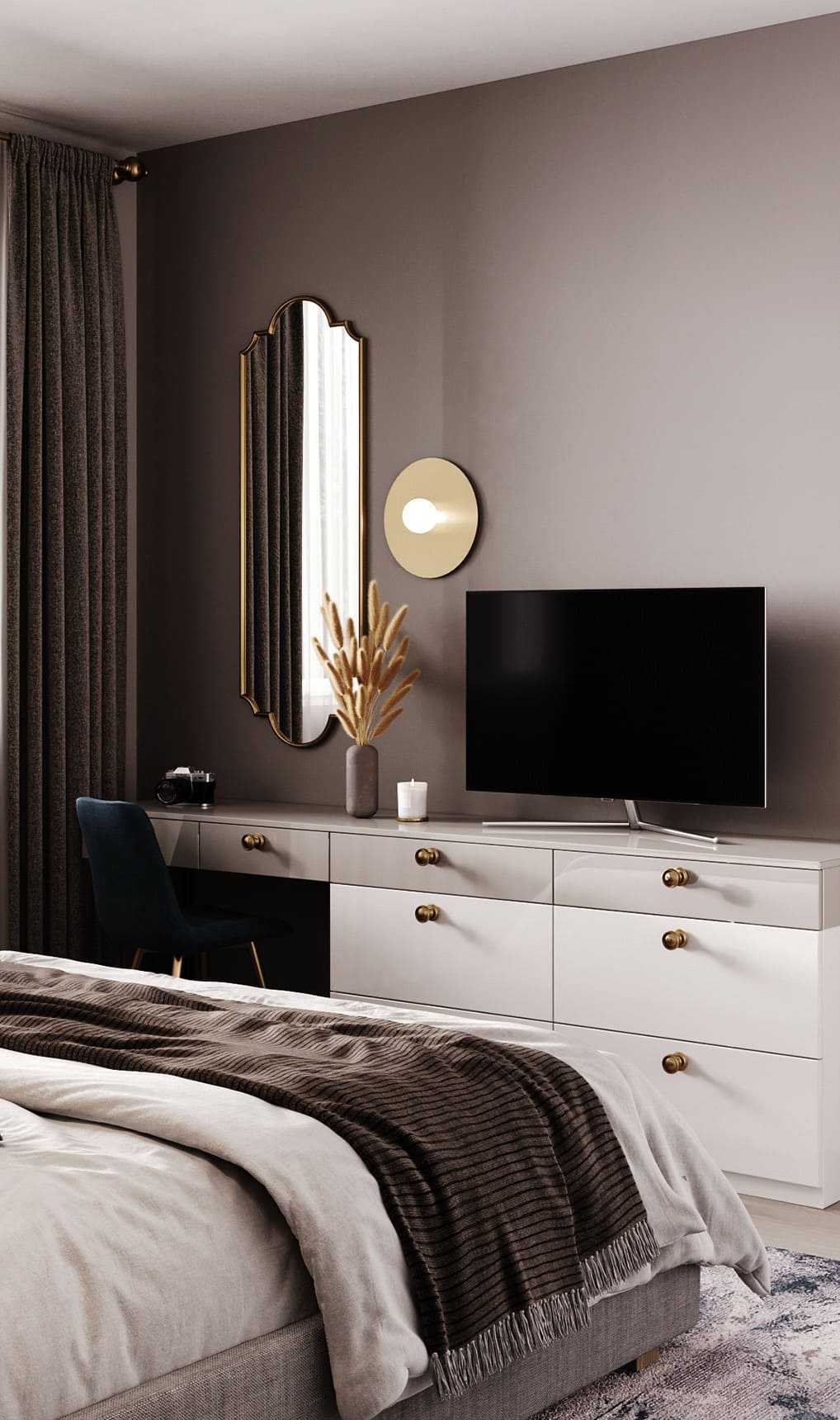 Телевизор повесьте напротив кровати, чтобы подставка не скрадывала ценные кв метры. Исключение: изголовье у окна в узкой длинной спальне. Тогда телевизор прикрепляют к потолку или строят для него перегородку из реек (она же зонирует комнату).