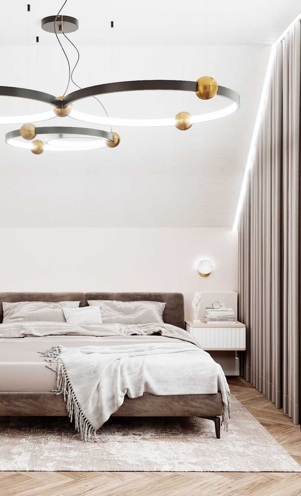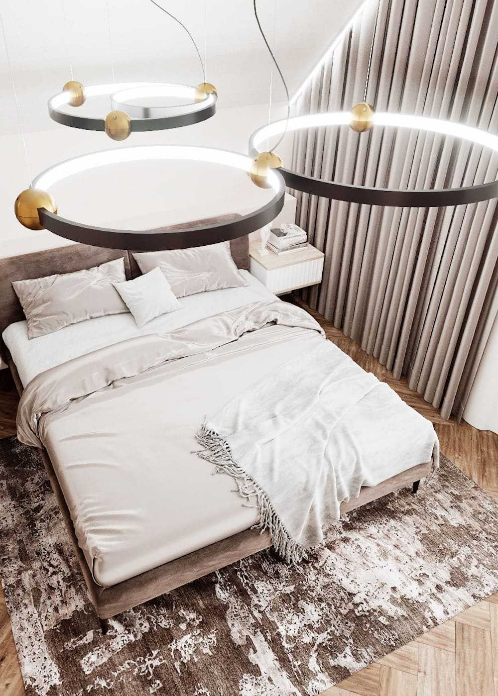 Визуально расширить пространство можно при помощи искусственного света. Скорее всего без центрального освещения обойтись не удастся. Но для приглушенной расслабленной атмосферы также можно установить по бокам кровати настенные светильники или низкие потолочные светильники. Если в спальне удалось расположить рабочее место, его также нужно подсветить настольной лампой.