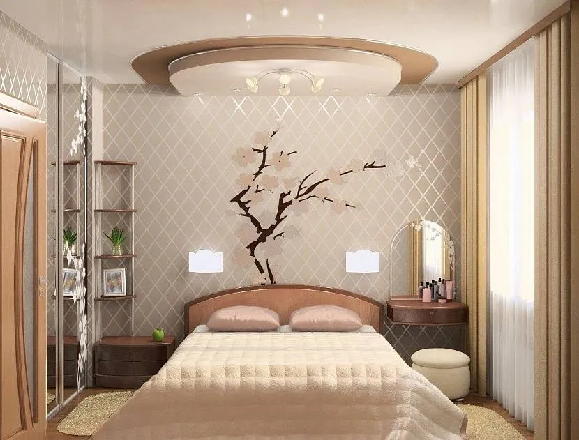 Изящный декор – настенное панно «Ветка сакуры». Выделяется коричневый обруч 2-уровневого натяжного потолка, спинка кровати, карниз и мебельИсточник homeli.ru