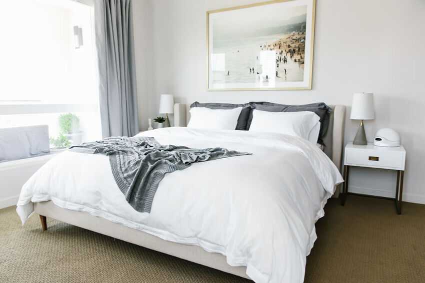 Чтобы добавить яркости и разбавить однотонный дизайн, следует использовать яркие подушки, плед или прикроватный коврик, которые будут выступать оригинальными акцентными деталями.