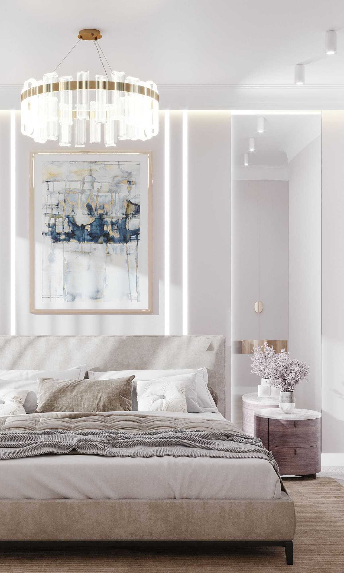 Современный дизайн спальни 9 кв. м. отличается активным использованием приема смешивания стилей. Арт-деко может прекрасно дополнять классику, в результате чего создается изящная обстановка. Разнообразие вносится стеной в светлых тонах, декорированной крупной картиной в интересной и привлекательной рамке.