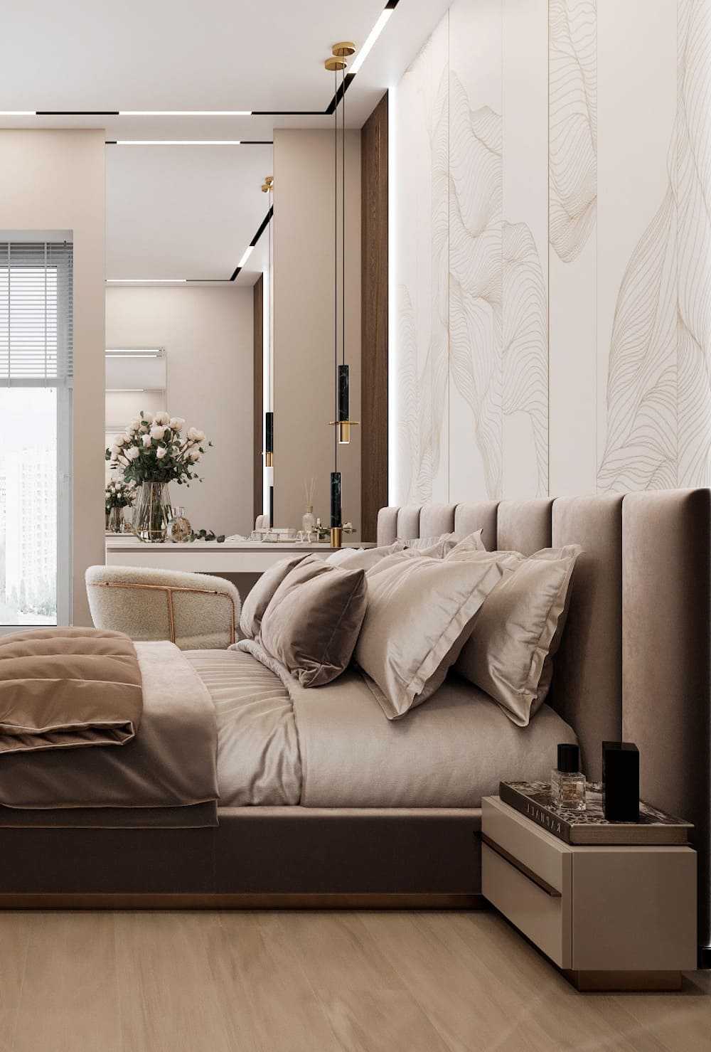 Классический стиль стремится создать уютную атмосферу за счет мягкого и гармоничного сочетания всей обстановки в спальне. Мебель часто выбирают в светлых или коричневых тонах. Для отделки используют нейтральный цвет — не белый, но и не слишком насыщенный. Также стены могут быть украшены декоративными плинтусами, лепниной.