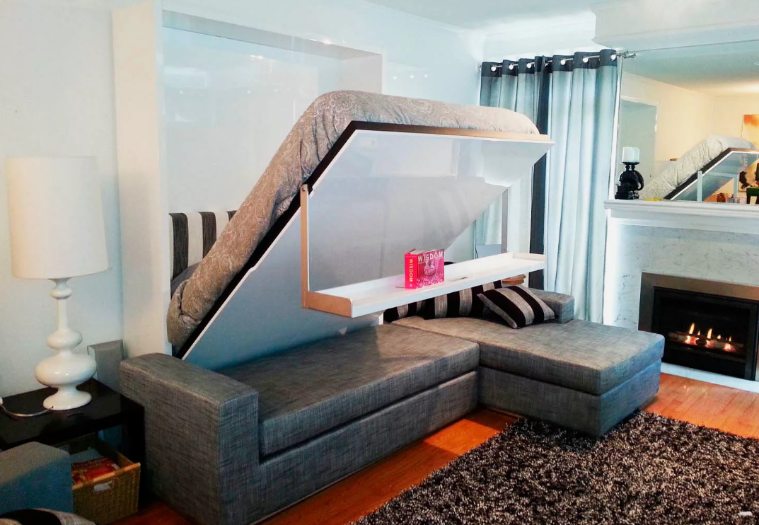 Раскладные кресла, кровать, которая на ночь убирается в шкаф или нишу. Есть и модели, которые специальным механизмом поднимаются к потолку, но стоят они недешево. Ночью такая мебель служит местом для отдыха, а днем освобождает пространство в гостиной.