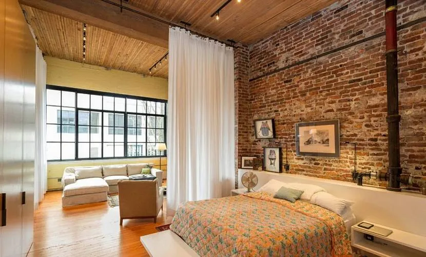 Кирпичная перегородка отделяет спальню от гостиной