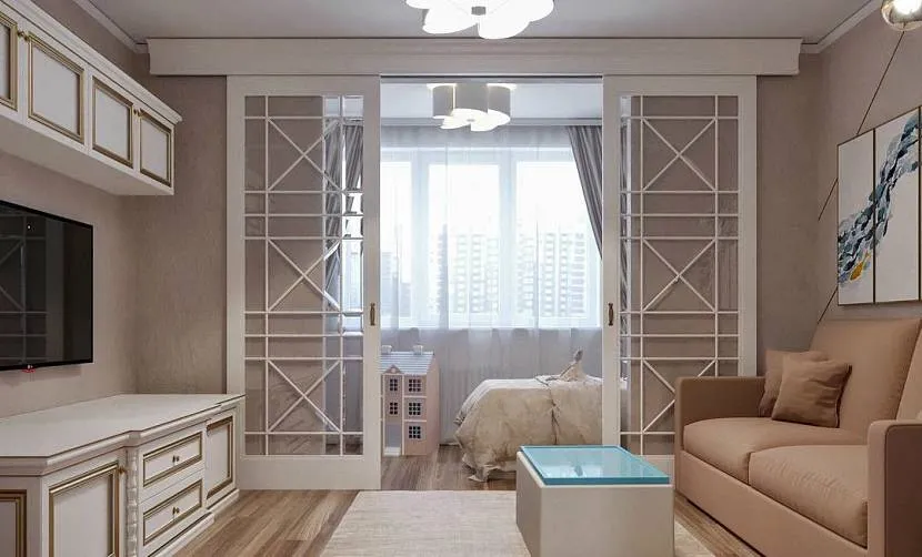 Хорошей заменой сплошным перегородкам могут стать раздвижные двери. Чтобы сохранить интимность спальной зоны можно выбрать матовое стекло или же дополнить прозрачный материал занавесками.