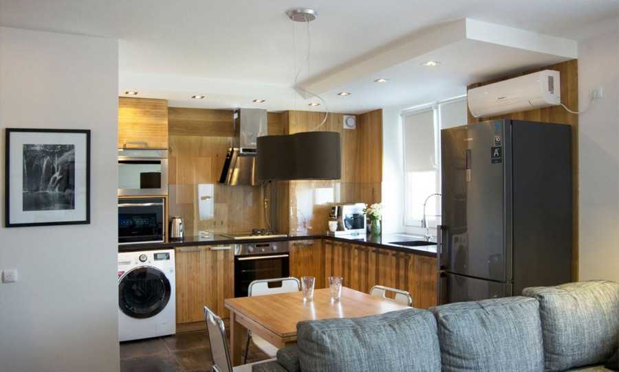 Всё это удобнее разместить в просторном помещении. Если квартира маленькая, для кухни покупают компактную мебель и встраиваемую бытовую технику. Это сохранит пространство.