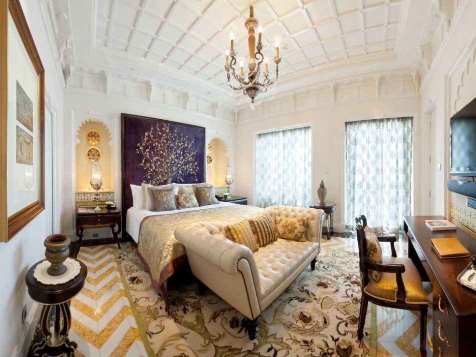 На фото вытянутая спальная комната с подвесными люстрами на потолке.