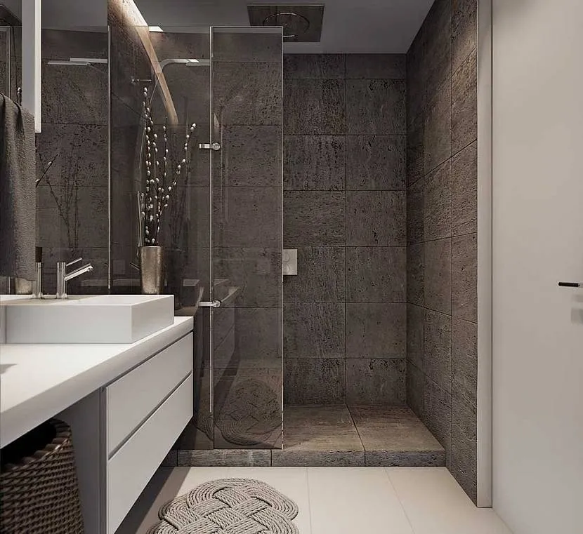 Вариант 3. Выбираем плитку крупного размера коричневых тонов. Ставим душевую кабину, справа от нее устанавливаем подвесной унитаз и раковину, над ними большое зеркало.