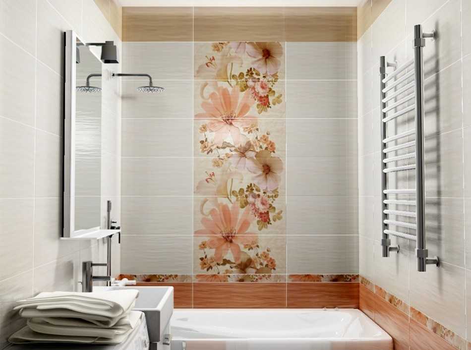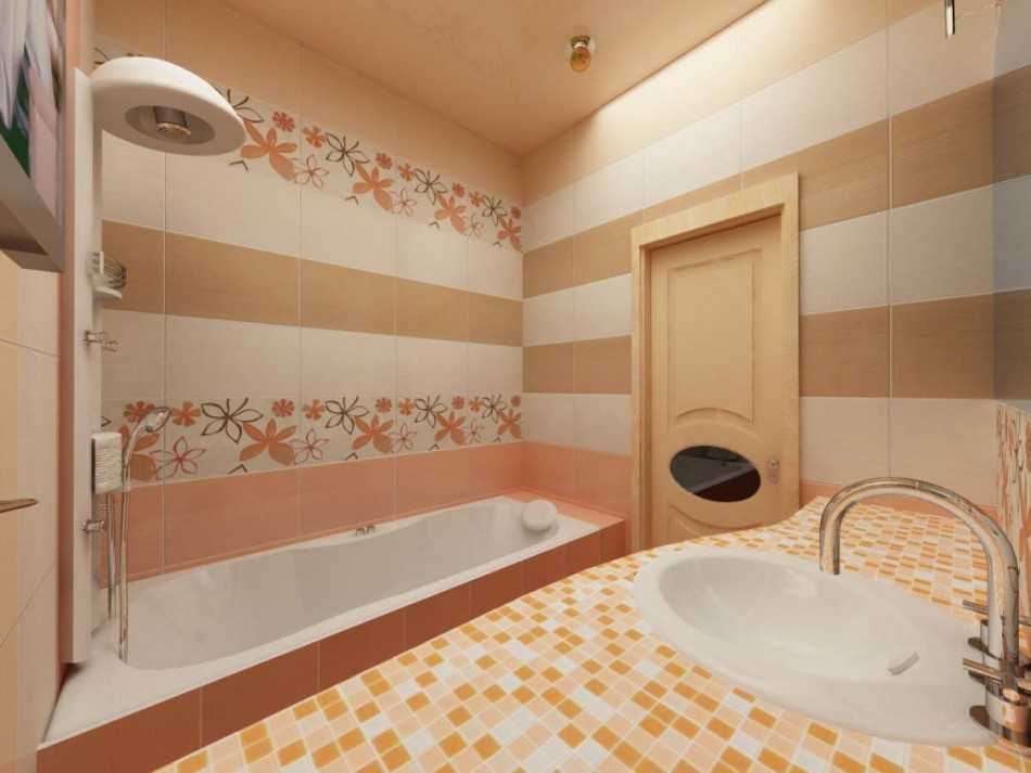 Хитрость первая – используй вертикальные и горизонтальные рисунки в отделке стен. Несколько ярких полос плитки или мозаики, расположенные в вертикальном или горизонтальном направлении вполне справятся с задачей зрительного увеличения высоты или ширины стен в ванной площадью 4 кв.м.