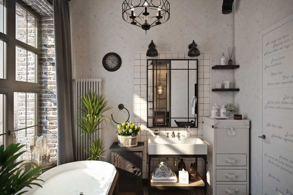 В отличие от громоздких классических стилей, лофт – демонстративно грубый и лаконичный со своими необработанными фактурами. Но он точно так же требует больше пространства, поэтому такой вариант не подойдет для маленьких совмещенных санузлов.
