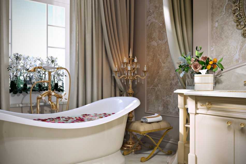 В классическом интерьере важна симметрия, и совмещенный санузел – не исключение. Поэтому заранее продумай расположение сантехники, мебели, декора и светильников. А для украшения используй пороги, декоративные плинтусы и карнизы, пилястры и колонны, потолочную лепнину, барельефы.