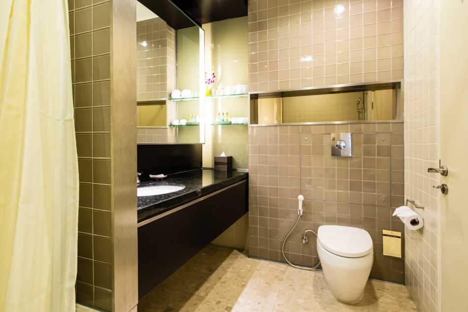 Современный стиль – это концентрация функциональности, практичности и элегантности. Именно этим он хорош для такого же предельно функционального и практичного санузла.