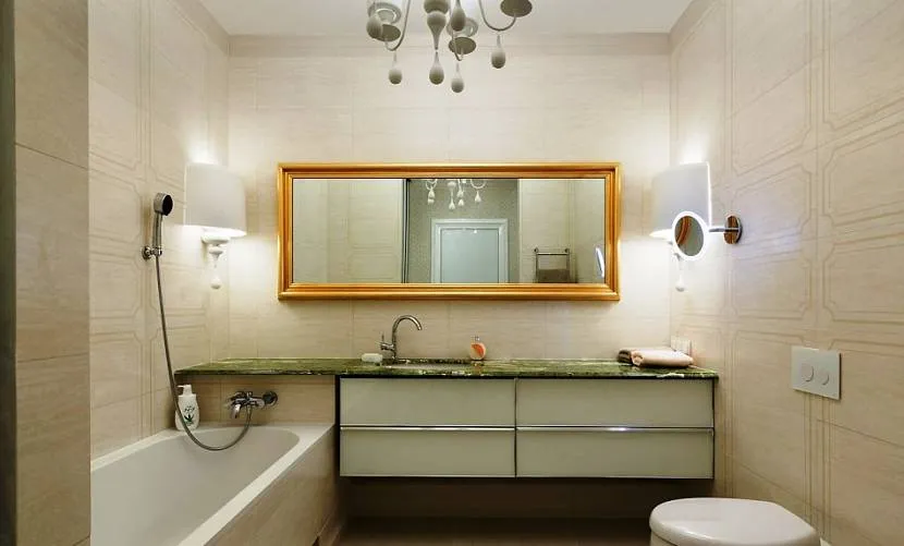 Бежевая ванная комната с люстрой Источник planirovkainfo.ru